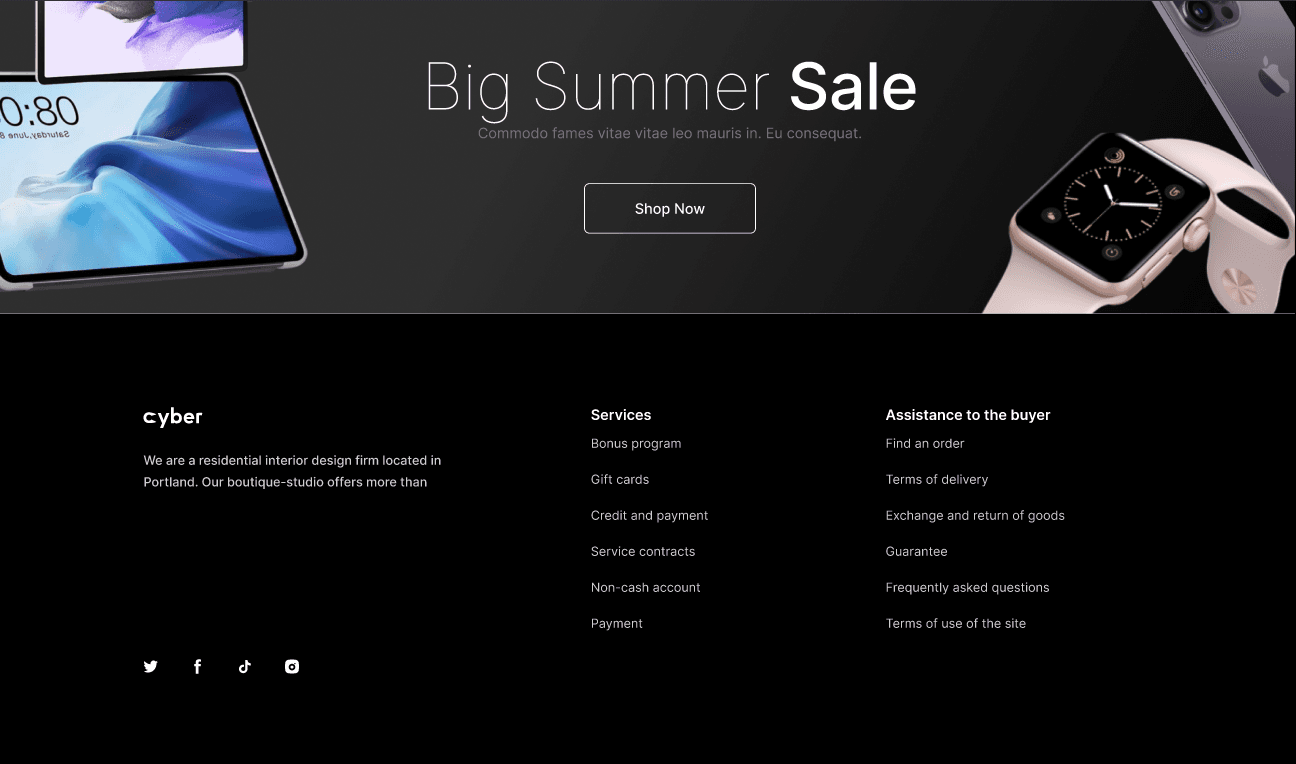 The Cyber e-commerce website design demonstrates my ability to design modern and user-friendly digital shopping experiences for technology brands. By combining clean UI design, clear product presentation, and intuitive navigation, the final design creates a professional and engaging online store for mobile devices.