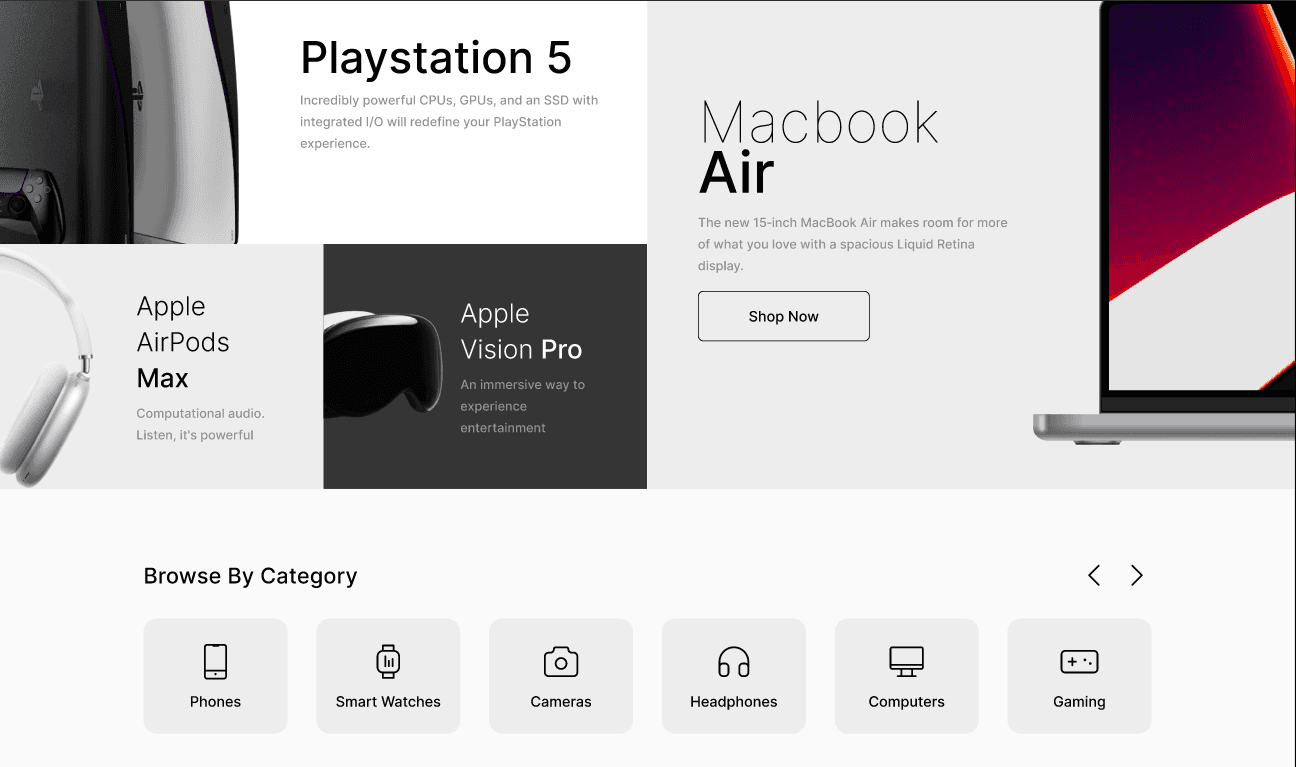 To solve this, I designed a structured and visually balanced e-commerce interface that highlights iPhones and accessories as the main focus. The layout includes clear product sections, featured device highlights, and well-organized categories to help users easily browse products. A modern color palette, clean typography, and minimal UI elements were used to create a sleek and premium technology-focused shopping experience.